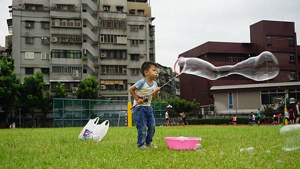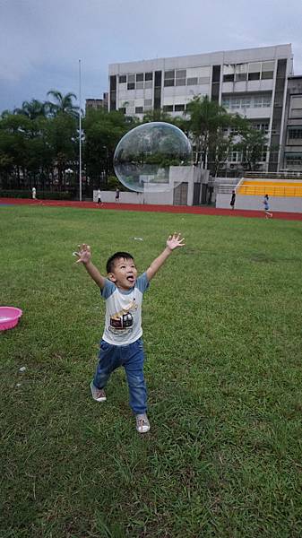 但從眼神中,看得出來 孩子充滿了成就感,因他“親手創造了大泡泡“!