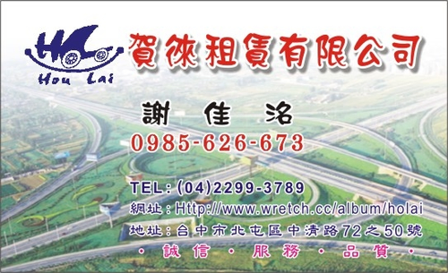 歡迎大家來到賀徠租車 賀徠租車 以低價格、高服務的方式, 提供您最好的車況及舒適品質, 設身處地的瞭解客戶所想要的, 是我們賀徠租車不變的原則, 親切熱忱的服務態度是佳洺我的宗旨, 幾個月下來已得不少客戶的讚許,非常感謝!! 但是佳洺我本人不會因此而自滿, 好還要更好,您的回應,是我動力的來源, 能提供給您一段美好的回憶, 比什麼都來的重要。 因此,您要是租車旅遊、洽公......等, 請由佳洺我來替您服務。 *********************************************** 擔心租賃車輛的價格高過您的預算嗎? 價格這方面,我想一直是很多學生、軍人頭痛的問題 所以!!憑學生證、軍人證作租賃車輛的客戶們, 立即享有九折折扣的優待!! 如租三天以上,佳洺我還可幫您做第二次降價哦!! 生日將近的客戶們也有折扣的優待哦! 只要是當月的壽星找我佳洺來租賃車輛, 就可享有九折的優待~~ 而當日壽星有七折的破盤大折扣呢 一般客戶租承三天以上也有降價的優惠哦!! 如果這些折扣還是高過您的預算, 請跟佳洺我議價囉~~~ *********************************************** 本店位於的地段是個交通便利的地點, 許多客運就在附近,接送服務全都在五分鐘內就可到達的地方 佳洺我做的資料有:國光、和欣、統聯、飛狗客運 現在只要完成訂車程序, 提供免費接送服務~~ (限定台中市各大車站及火車站) 還可幫忙預訂回程的車票哦!!(以上四種客運的車票) 懇請各位給佳洺我機會來為您服務! 謝謝各位。 -------------------------------------------------------------- 好消息!!!好消息!!! 本公司已進全新車款(FORTIS)做為租賃車輛 想要開新車的客戶們不要錯過這個時機哦