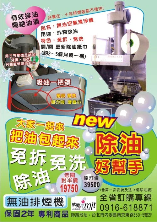 台灣無油排煙機簡介dm;專為老闆們創業用的排煙機「適用於夜市炸物創業、百貨公司炸物類連鎖經營、炸物食品的加盟連鎖、鹽酥雞經營、香腸烤肉經營…0916618871