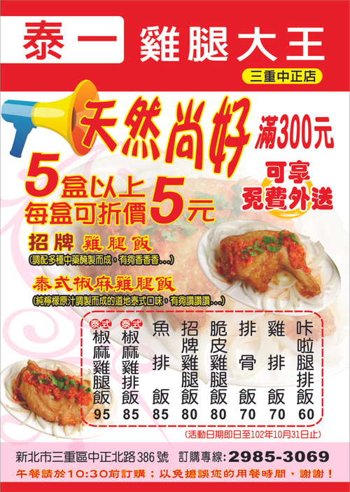 泰一雞腿大王快餐店,用心製作各類便當,採用天然食材醃製.活體肉品作主食材的良心事業